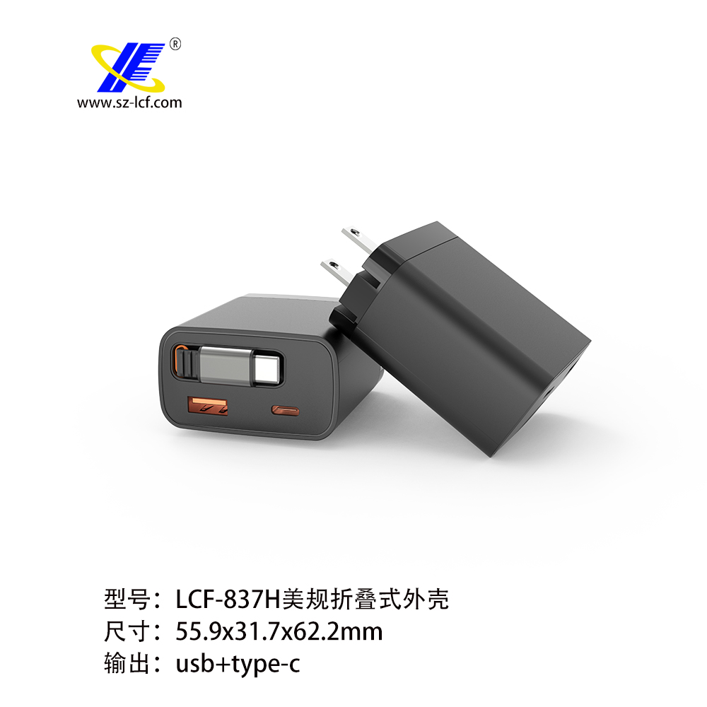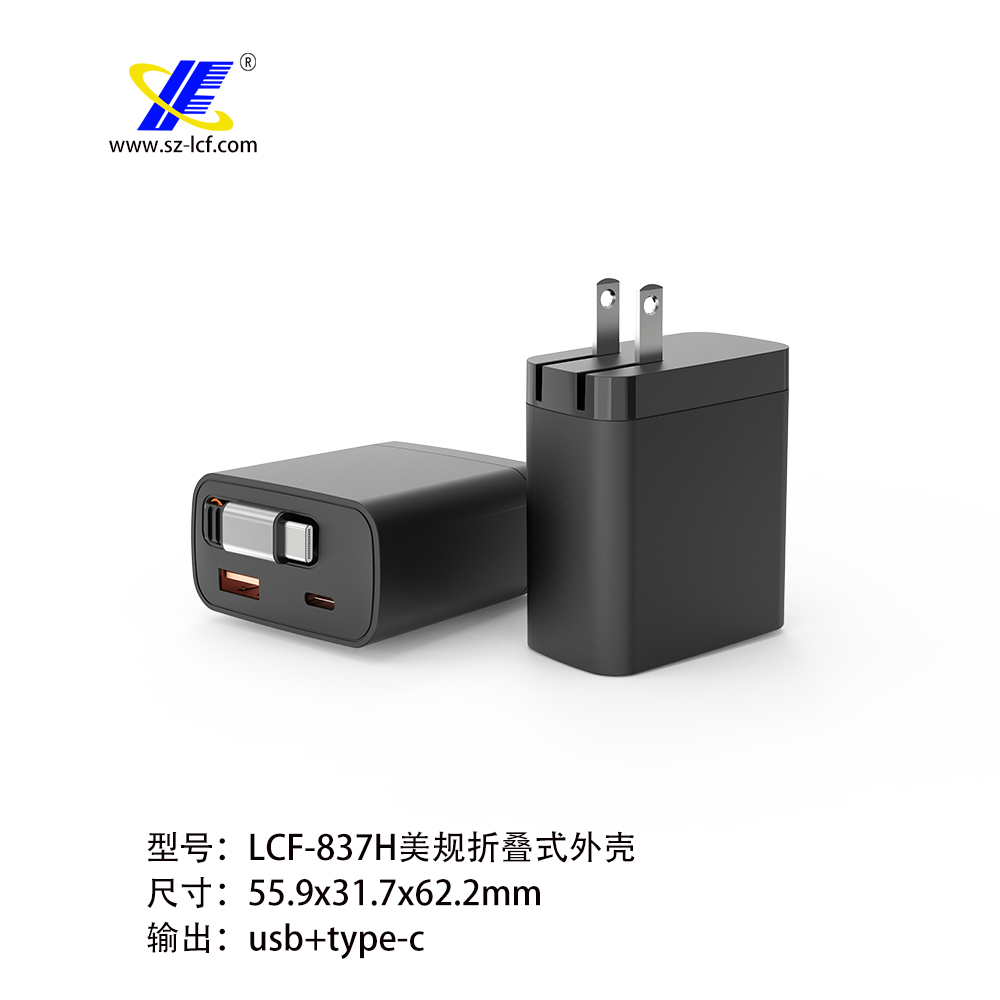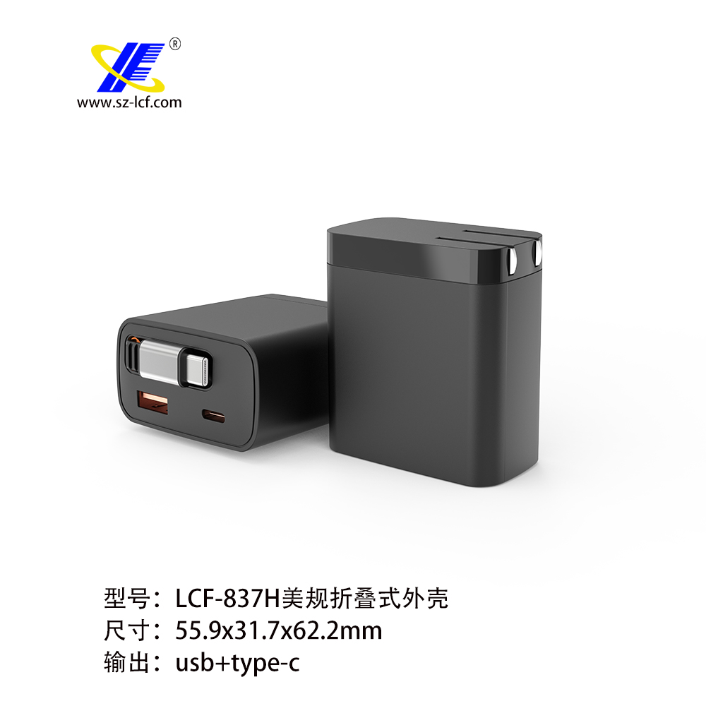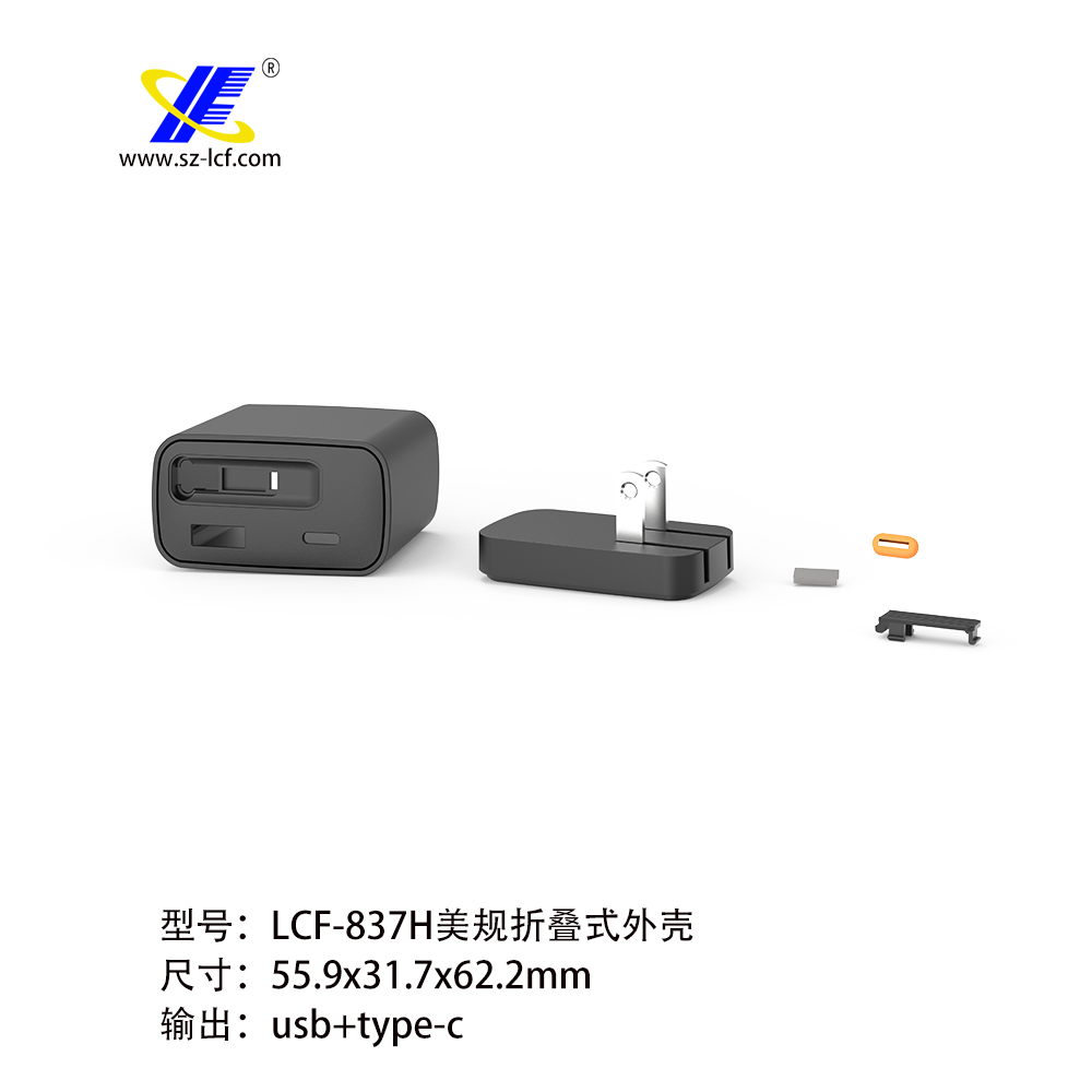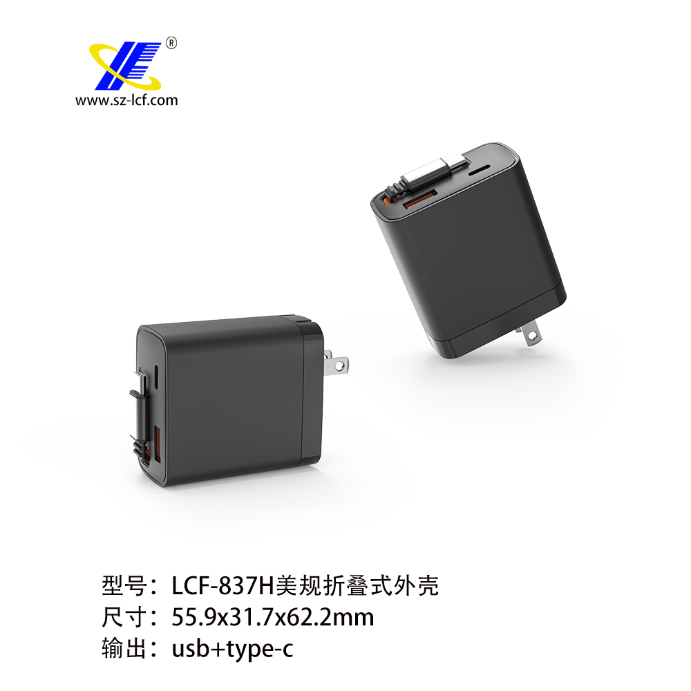 描述:65W折疊美規充電器外殼 采用PC塑料材質做的,符合ROHS環保標準,性能好,耐高溫,尺寸:55.9X31.7X62.2mm規格:中規、美規 廣泛應用于多種類型的充電器外殼。